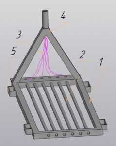 Нагреватель состоит из прямоугольной металлической рамы 1, в которой закреплены стальные трубы с алюминиевым оребрением 2. Один торец труб герметично заварен, ко второму торцу герметично приварен штуцер. В трубы установлены трубчатые нагреватели патронного типа с питающими термостойкими кабелями 3. Герметичность установки нагревателей в трубы и питающего кабеля обеспечивают муфты с фторопластовыми прокладками. Питающие кабели всех труб собраны в пучок на рамке 4. Транспортирование и укладка нагревателя на разогреваемые продукты производится с помощью ручек 5, расположенных снаружи рамы.